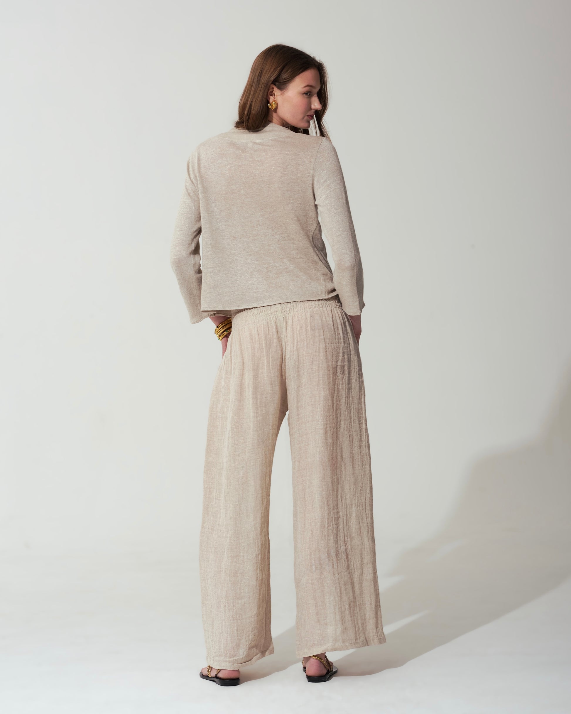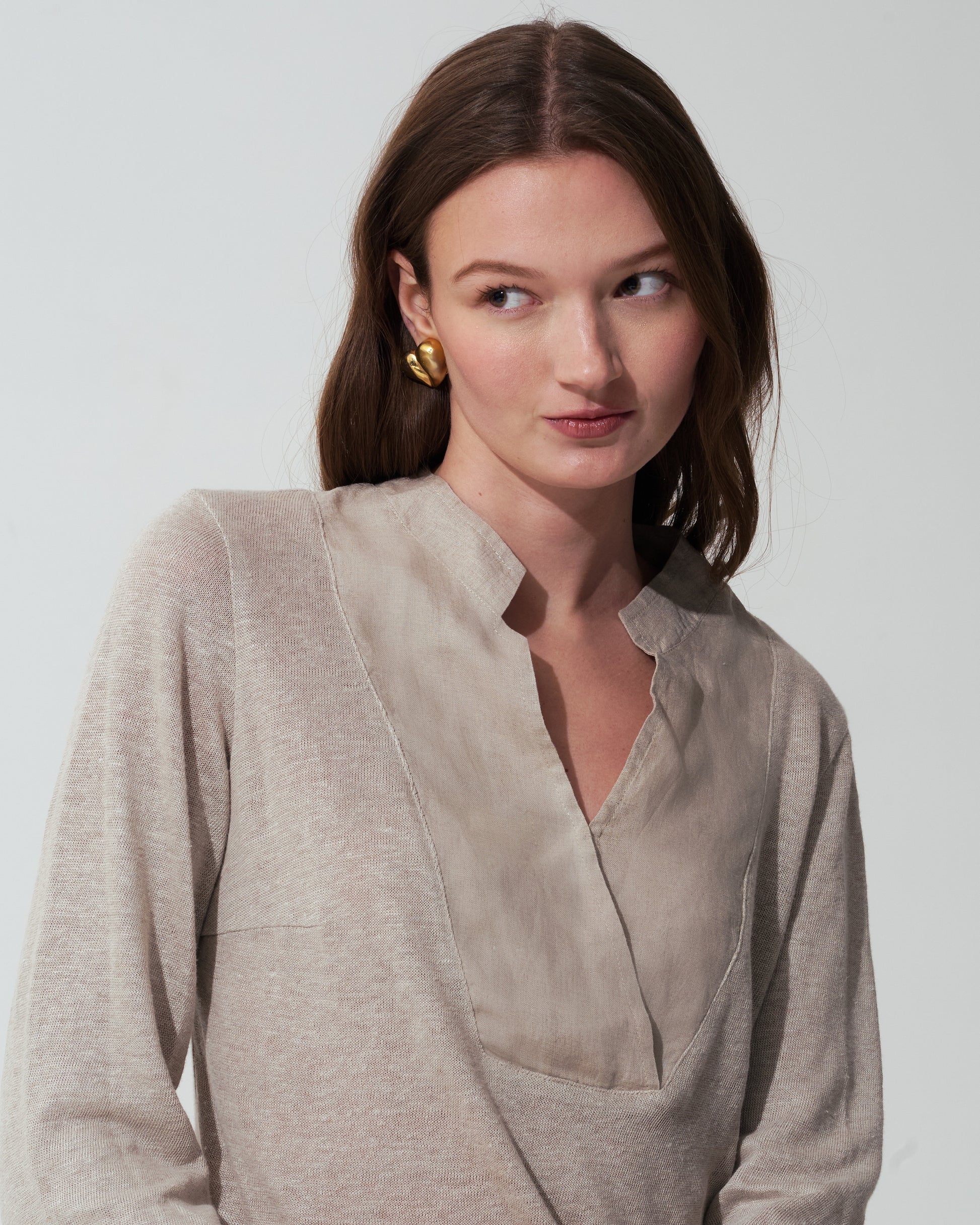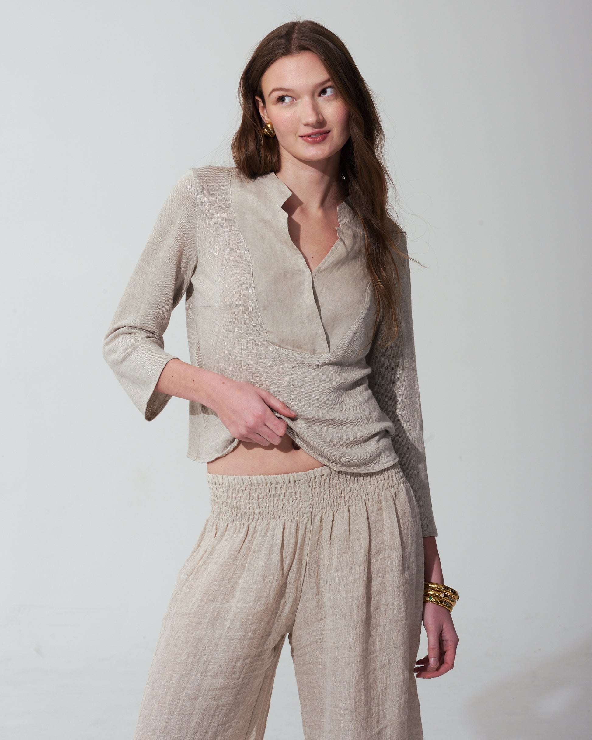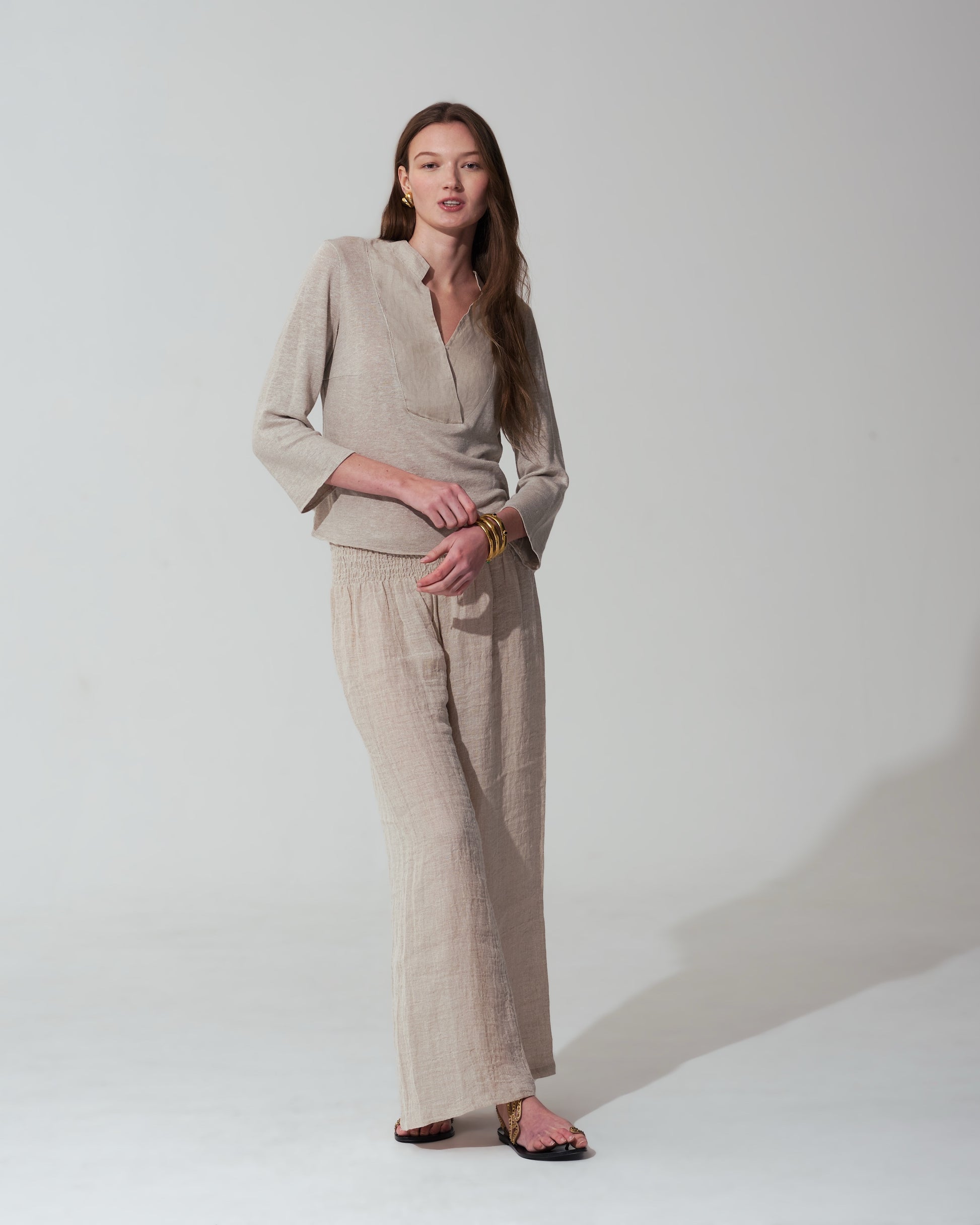 Designed with understated elegance, this notched-neck shirt is crafted from soft-waved  linen gauze for a naturally light and breathable feel. The neckline and split are finished in smooth regular linen, creating a subtle contrast in texture and adding refined structure to the silhouette.