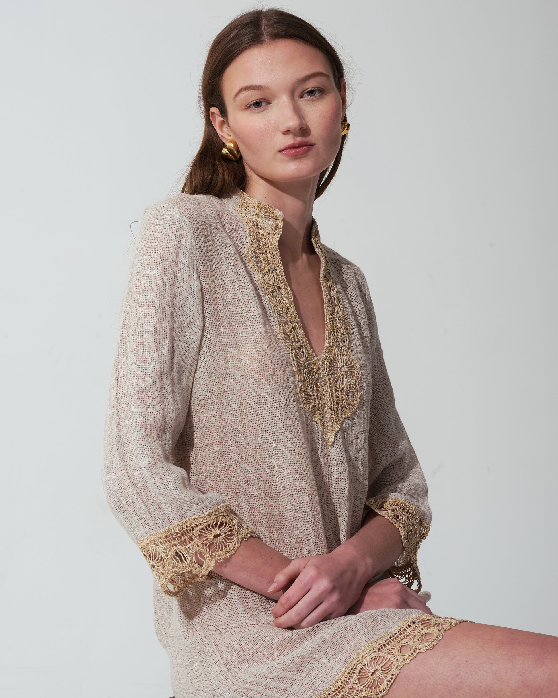 Maria Mini Dress Discover the perfect blend of comfort and style with this sophisticated beach cover-up crafted from relaxed-wave gauze linen that moves with you. Delicate lace trimmings add an alluring feminine touch, while the flattering mandarin collar creates a polished silhouette. In a versatile sand tone.