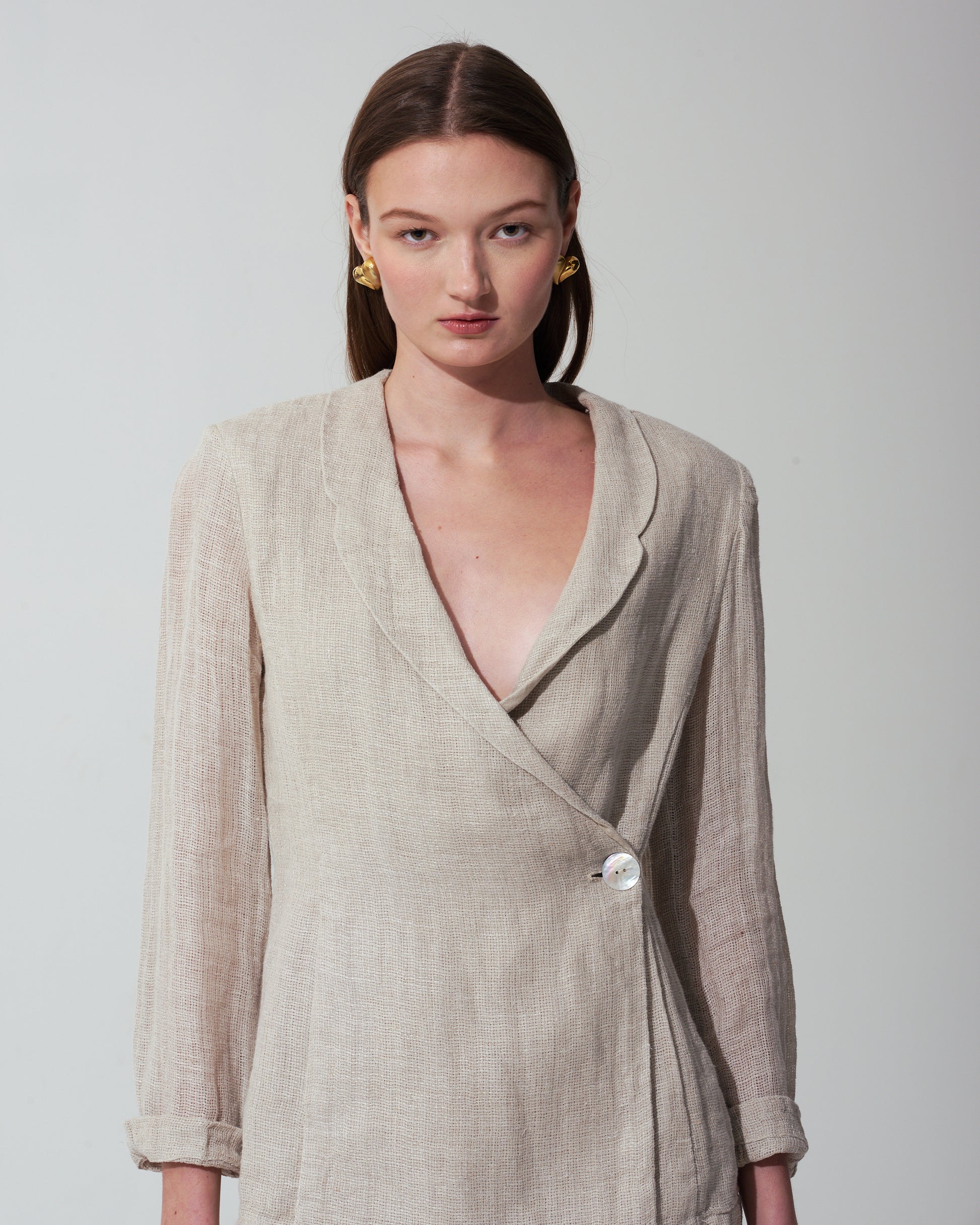 The Milano Wrap Blazer epitomizes understated elegance with its refined wrap silhouette crafted from softly waved gauze linen. Made in Italy, this piece features lustrous mother-of-pearl buttons that catch the light with subtle sophistication. Layer it with the Milano trousers to create a polished, effortlessly chic ensemble perfect for warm-weather occasions. The breathable linen construction ensures comfort without compromising on style, making it an essential investment for the discerning wardrobe.